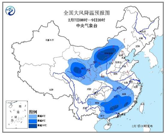 今天冷空氣將強勢發(fā)威,橫掃中東部,氣溫普降4~8℃。中央氣象臺預計,受冷空氣影響,7日至9日,我國中東部大部地區(qū)自北向南將出現(xiàn)大范圍大風降溫,平均氣溫將普遍下降4℃以上,其中,青海東部、陜西北部、內蒙古中部、山西北部、貴州東南部、湖南中南部、江西中南部、福建西部、廣西北部和廣東北部等地氣溫將下降8℃以上,局地超過10℃。長江以北地區(qū)并伴有4~6級偏北風,東部和南部海區(qū)風力有7~9級。中央氣象臺2月7日06時繼續(xù)發(fā)布寒潮藍色預警。