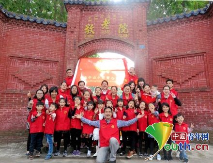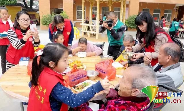 劉天明帶領(lǐng)小欖中小學(xué)學(xué)生給敬老院老人們喂飯、敬老。本人供圖