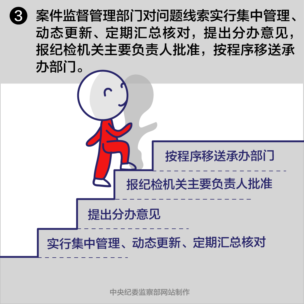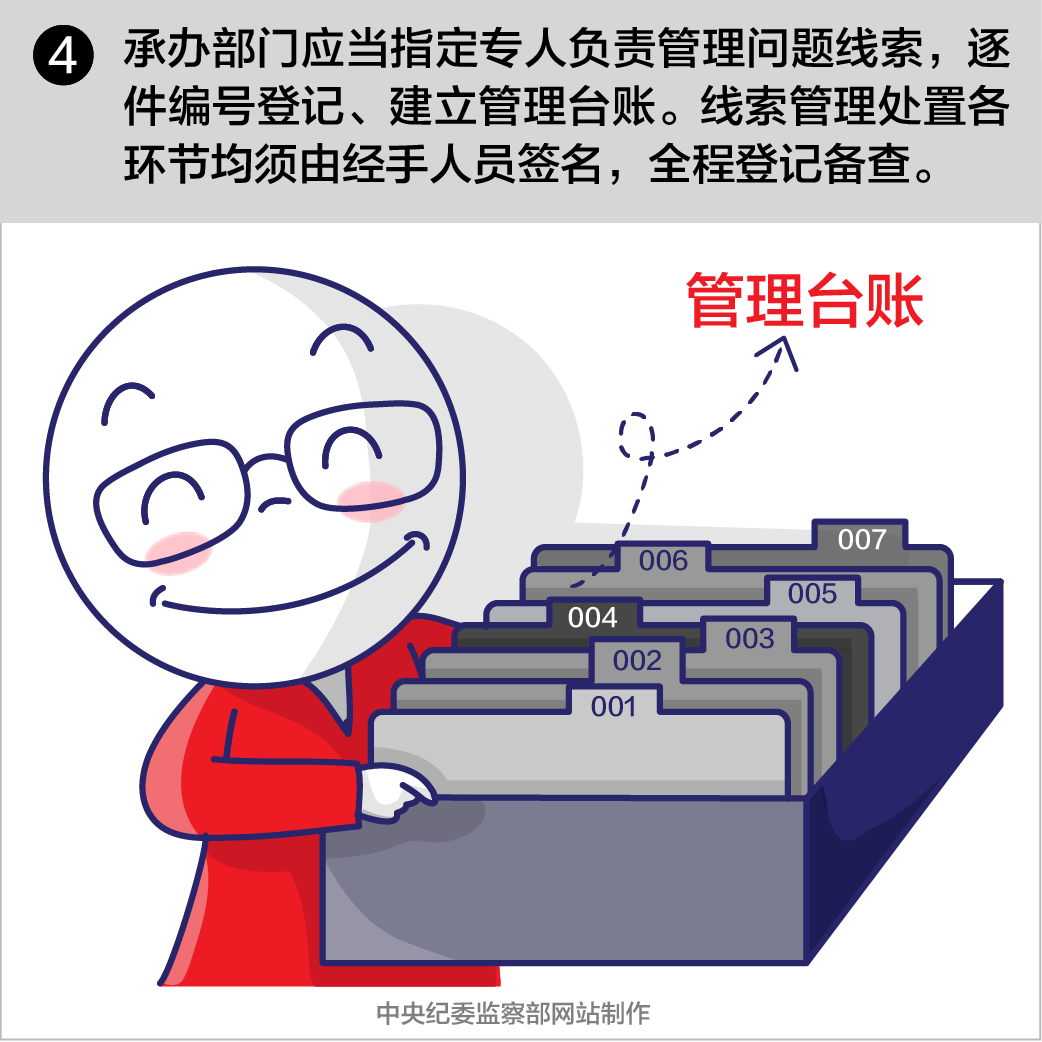 第十四條案件監(jiān)督管理部門對問題線索實行集中管理、動態(tài)更新、定期匯總核對,提出分辦意見,報紀(jì)檢機關(guān)主要負責(zé)人批準(zhǔn),按程序移送承辦部門。承辦部門應(yīng)當(dāng)指定專人負責(zé)管理問題線索,逐件編號登記、建立管理臺賬。線索管理處置各環(huán)節(jié)均須由經(jīng)手人員簽名,全程登記備查。