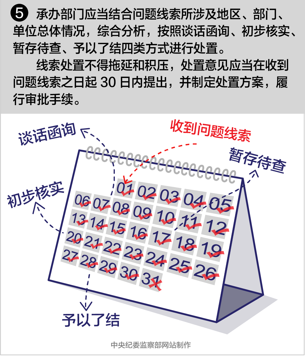 線索處置不得拖延和積壓,處置意見應(yīng)當(dāng)在收到問題線索之日起30日內(nèi)提出,并制定處置方案,履行審批手續(xù)。