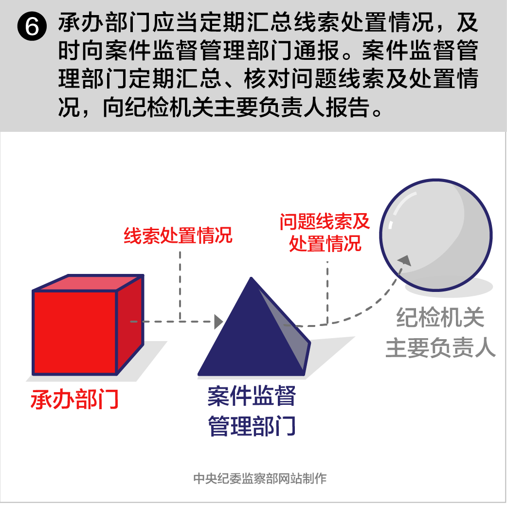 第十七條承辦部門應(yīng)當(dāng)定期匯總線索處置情況,及時向案件監(jiān)督管理部門通報。案件監(jiān)督管理部門定期匯總、核對問題線索及處置情況,向紀(jì)檢機關(guān)主要負責(zé)人報告。