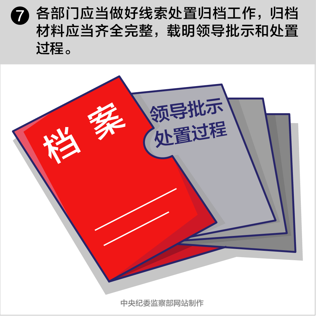 各部門應(yīng)當(dāng)做好線索處置歸檔工作,歸檔材料應(yīng)當(dāng)齊全完整,載明領(lǐng)導(dǎo)批示和處置過程。
