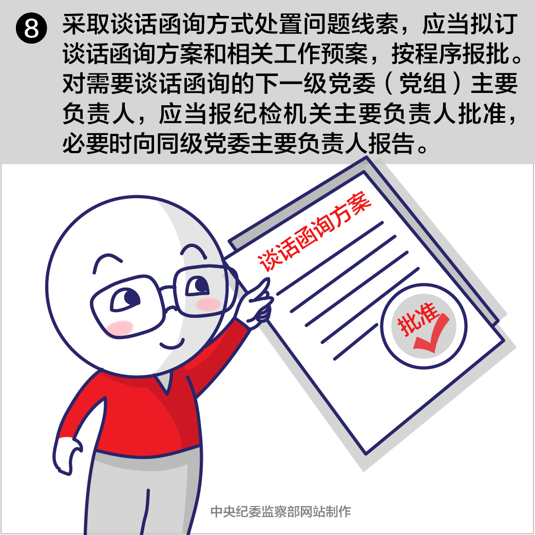 第十八條采取談話函詢方式處置問題線索,應(yīng)當(dāng)擬訂談話函詢方案和相關(guān)工作預(yù)案,按程序報批。對需要談話函詢的下一級黨委(黨組)主要負責(zé)人,應(yīng)當(dāng)報紀(jì)檢機關(guān)主要負責(zé)人批準(zhǔn),必要時向同級黨委主要負責(zé)人報告。