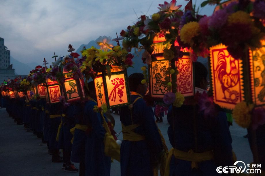2月14日夜間,甘肅甘南藏族自治州舟曲縣境內,二百余名男性身著藍色盤口大褂,腰間纏或紅、或綠、或黃的各色絲質腰帶,將寫有菩薩名字的旗號迎到燈會聚點。 (央視網記者 王小英 報道 衛(wèi)斌/攝)