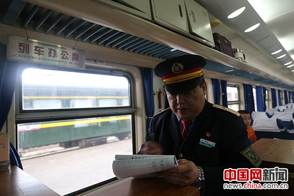 2月14日,K51/52次列車長朱運濤在列車辦公席查閱工作記錄。中國網(wǎng)記者 郭澤涵 攝