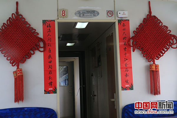 2月14日,K51/52次列車的餐車間懸掛的中國結(jié)和春聯(lián)。中國網(wǎng)記者 郭澤涵 攝