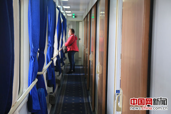 2月14日,一名乘務員正在軟臥車廂為旅客換票。中國網(wǎng)記者 郭澤涵 攝