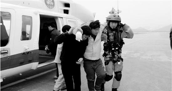 昨天傍晚5點(diǎn)35分,東海救助局一架直升機(jī)降落舟山普陀山機(jī)場(chǎng),里面搭載著獲救的“冀黃漁02698”船7名船員,他們走出機(jī)艙時(shí)臉色沉重,其中一名船員因左腳受傷,只能被攙扶著出來。其余13名船員仍下落不明,搜救工作仍在繼續(xù)。