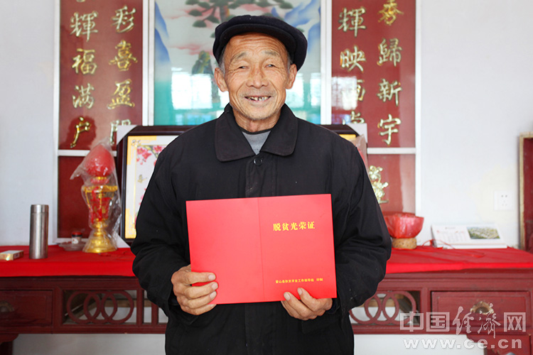 2016年12月19日,安徽省六安市,霍山縣但家廟鎮(zhèn)觀音巖村的貧困戶廣存祥老人拿到脫貧光榮證。圖片來(lái)源:CFP
