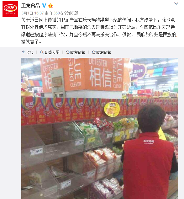 有網(wǎng)友爆料:武漢樂天瑪特內(nèi)衛(wèi)龍辣條全部撤柜,“一根辣條都不給樂天留”。@衛(wèi)龍食品 1日稱,傳聞除地點有誤外其他均屬實,目前已撤架的樂天瑪特為江蘇鹽城,不過全國范圍樂天瑪特渠道已按程序陸續(xù)下架,今后將不再與樂天合作。
