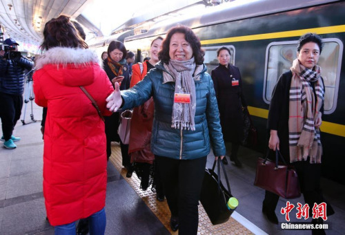3月2日清晨,出席十二屆全國人大五次會議的黑龍江代表團(tuán)乘火車抵達(dá)北京,成為首批抵京的京外代表。 中新社記者 劉震 攝