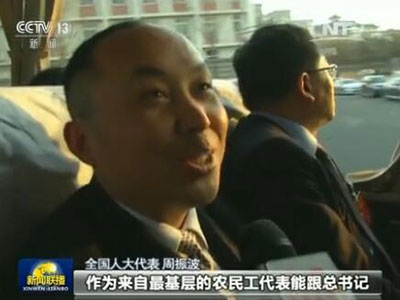 全國人大代表周振波:沒有想到,真的。我這個來自最基層的農(nóng)民工代表能跟總書記坐同一排審議政府工作報告,更是沒想到,總書記說的話凈是接地氣的,凈是老百姓關(guān)心的,他說我們要為老百姓干實事、解難事,聽到這話真的是開心得不得了。