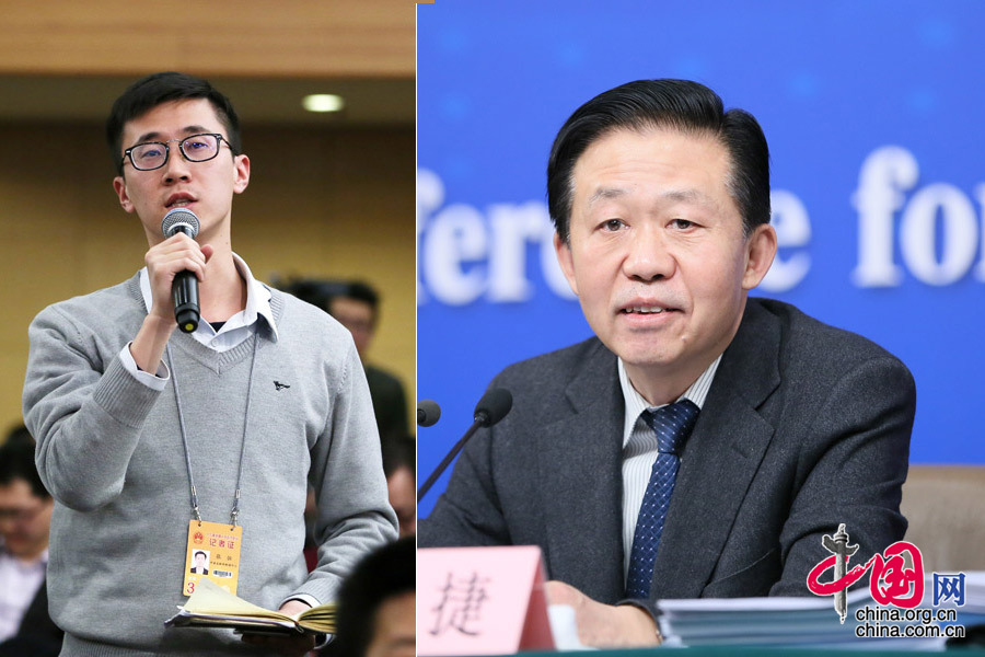 中國網記者向財政部部長肖捷提問。中國網 高聰攝影
