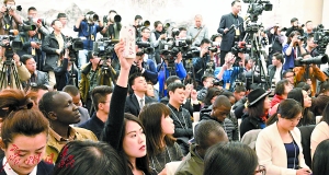 廣州日?qǐng)?bào)全媒體記者廖靖文在全國(guó)政協(xié)十二屆五次會(huì)議記者會(huì)上提問。