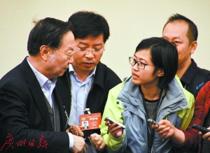 廣州日?qǐng)?bào)全媒體記者申卉在采訪全國(guó)政協(xié)委員李毅中。