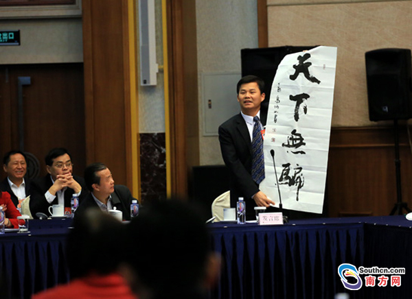 “電信詐騙是高科技、信息化、專業(yè)化的犯罪。為懲治犯罪,國(guó)家為此投入巨大成本!痹诮裉斓膹V東代表團(tuán)全體會(huì)議上,揪著電信詐騙問(wèn)題已達(dá)八年之久的基層人大代表陳偉才再次就如何打擊跨境電信詐騙發(fā)聲,并重提到相關(guān)部門應(yīng)在源頭開(kāi)展治理,堵住漏洞。為了讓與會(huì)的其他人大代表更好地了解打擊跨境電信詐騙的迫切性和重要性,他還亮出了自制的三塊圖解作詳細(xì)說(shuō)明,他希望能完成一個(gè)小目標(biāo)——天下無(wú)騙!