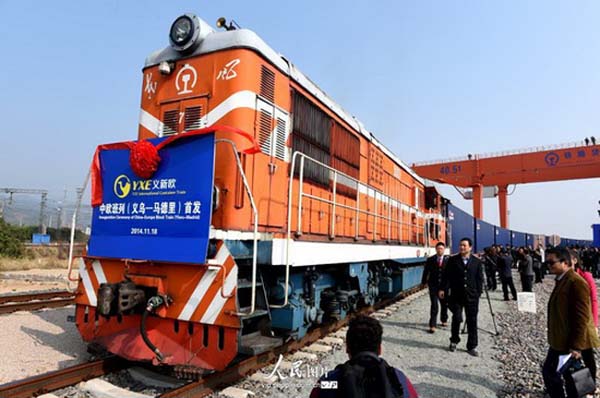 2014年11月18日,“中歐班列(義烏-馬德里)”首班從義烏鐵路西站啟程,全程13052公里,運行時間約21天。圖片來源:人民網(wǎng)