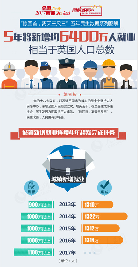 對于2017年發(fā)展的主要預(yù)期目標(biāo),《政府工作報告》提出:“城鎮(zhèn)新增就業(yè)1100萬人以上,城鎮(zhèn)登記失業(yè)率4.5%以內(nèi)!苯衲瓿擎(zhèn)新增就業(yè)預(yù)期目標(biāo)比去年多100萬人,突出了更加重視就業(yè)的導(dǎo)向。據(jù)估算,中國5年來新增約6400萬就業(yè)人口,相當(dāng)于英國全國的人口數(shù)。