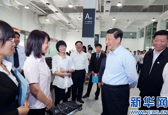 2013年5月14日至15日,中共中央總書記、國家主席、中央軍委主席習(xí)近平在天津考察工作。這是習(xí)近平在天津人力資源發(fā)展促進(jìn)中心與應(yīng)聘人員親切交談。新華社記者蘭紅光攝