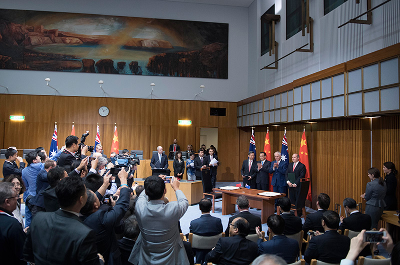 圖為3月24日,國(guó)務(wù)院總理李克強(qiáng)與澳大利亞總理特恩布爾在堪培拉議會(huì)大廈,共同見(jiàn)證了中澳兩國(guó)八份合作文件的簽署,內(nèi)容涉及中澳自貿(mào)協(xié)定、經(jīng)貿(mào)投資、檢驗(yàn)檢疫、氣候變化、農(nóng)業(yè)、文化、教育等諸多領(lǐng)域。