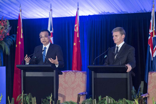 當(dāng)?shù)貢r間3月27日上午,李克強總理在惠靈頓總理府同新西蘭總理英格利希舉行會談。會談后,李克強和英格利希共同見證了兩國關(guān)于經(jīng)貿(mào)、農(nóng)業(yè)、電子商務(wù)、教育、知識產(chǎn)權(quán)保護、環(huán)保等領(lǐng)域9份合作協(xié)議的簽署。