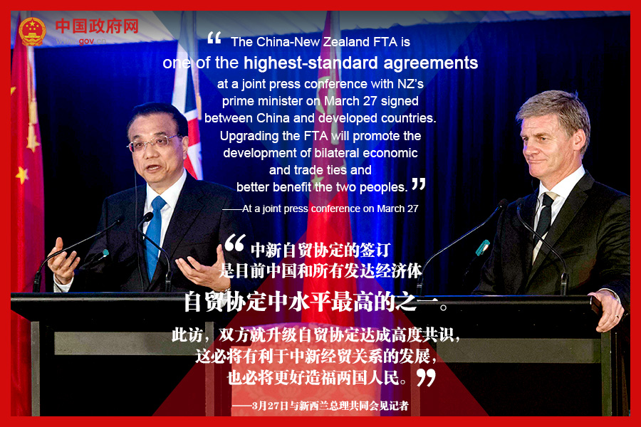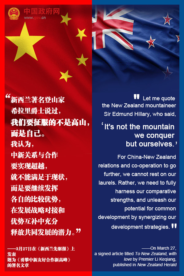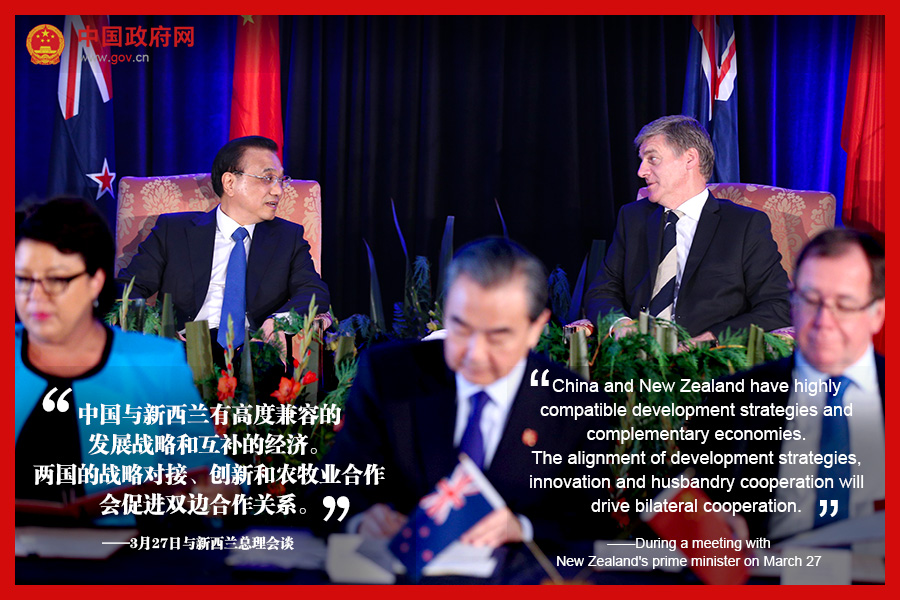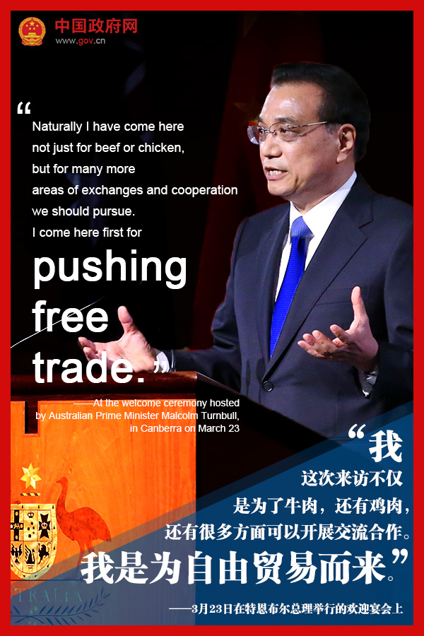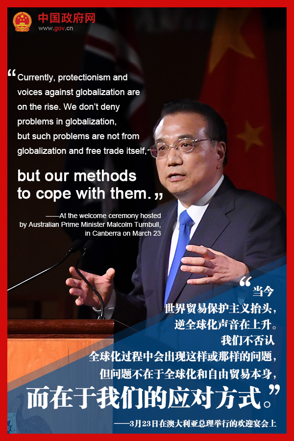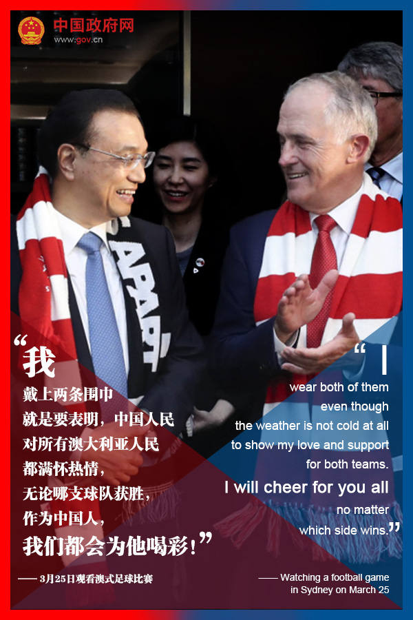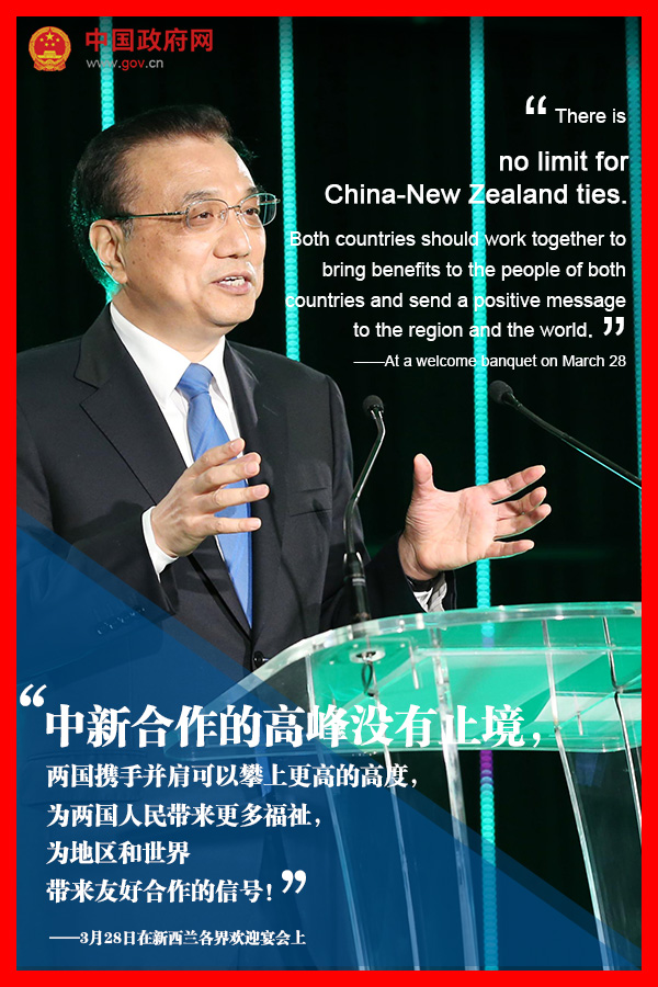 國(guó)務(wù)院總理李克強(qiáng)于3月22日至29日對(duì)澳大利亞和新西蘭進(jìn)行正式訪問(wèn),這也是11年來(lái)中國(guó)總理對(duì)這兩個(gè)國(guó)家的首次訪問(wèn)。海外關(guān)注李克強(qiáng)總理的哪些話?中國(guó)政府網(wǎng)用8張海報(bào)帶你一起來(lái)看看,雙語(yǔ)!
