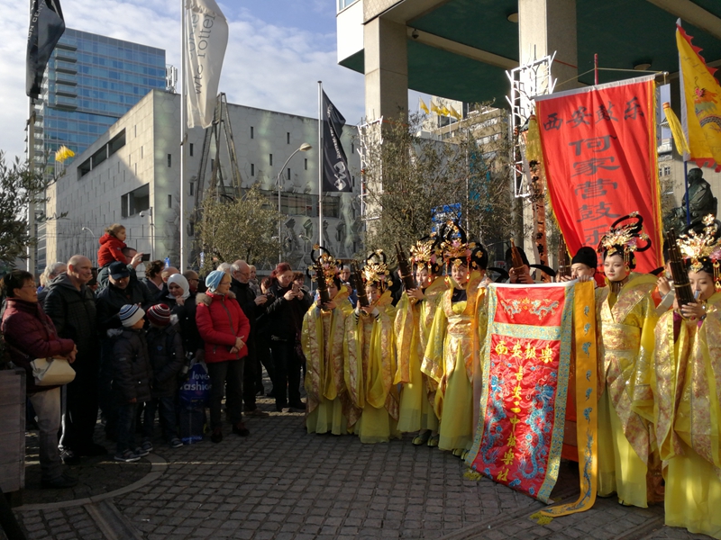 2017年春節(jié),何家營樂社在荷蘭鹿特丹市街心廣場進(jìn)行鼓樂表演