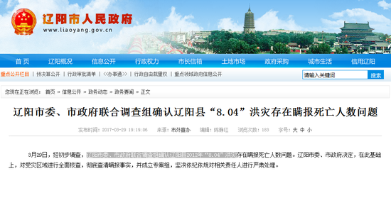 3月29日,經(jīng)初步調(diào)查,遼陽(yáng)市委、市政府聯(lián)合調(diào)查組確認(rèn)遼陽(yáng)縣2012年“8.04”洪災(zāi)存在瞞報(bào)死亡人數(shù)問(wèn)題。遼陽(yáng)市委、市政府決定,在此基礎(chǔ)上,對(duì)受災(zāi)區(qū)域進(jìn)行全面核查,徹底查清瞞報(bào)事實(shí),并成立專案組,堅(jiān)決依紀(jì)依規(guī)對(duì)相關(guān)責(zé)任人進(jìn)行嚴(yán)肅處理。