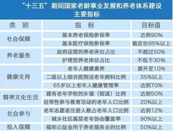 《規(guī)劃》立足于我國“未富先老”的現(xiàn)實,提出了4個方面的目標(biāo)、設(shè)置了8個方面的主要任務(wù):多支柱、全覆蓋、更加公平、更可持續(xù)的社會保障體系更加完善,居家為基礎(chǔ)、社區(qū)為依托、機(jī)構(gòu)為補充、醫(yī)養(yǎng)相結(jié)合的養(yǎng)老服務(wù)體系更加健全,有利于政府和市場作用充分發(fā)揮的制度體系更加完備,支持老齡事業(yè)發(fā)展和養(yǎng)老體系建設(shè)的社會環(huán)境更加友好等四項發(fā)展目標(biāo),以及健全完善社會保障體系、健全養(yǎng)老服務(wù)體系、健全健康支持體系、繁榮老年消費市場、推進(jìn)老年宜居環(huán)境建設(shè)、豐富老年人精神文化生活、擴(kuò)大老年人社會參與、保障老年人合法權(quán)益等八大重點任務(wù)。