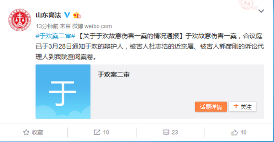 #于歡案二審# [關(guān)于于歡故意傷害一案的情況通報(bào)]于歡故意傷害一案,合議庭已于3月28日通知于歡的辯護(hù)人,被害人杜志浩的近親屬、被害人郭彥剛的訴訟代理人到我院查閱案卷。