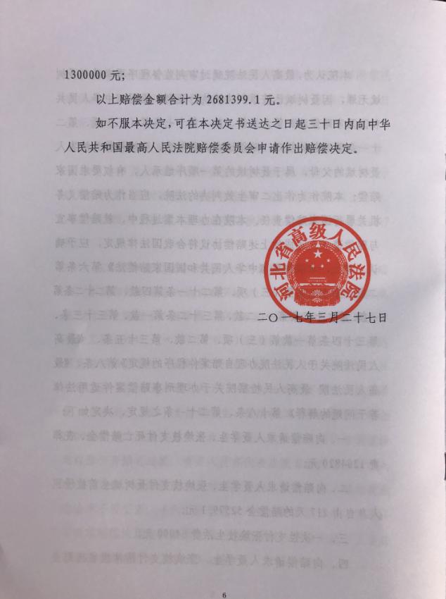 記者今天從河北高院獲悉,3月28日,河北高院已向聶樹斌父母送達(dá)了國家賠償決定書,據(jù)河北高院介紹,在這起國家賠償案辦理過程中,河北高院依據(jù)相關(guān)法律與賠償申請人進(jìn)行了充分協(xié)商,雙方就賠償項(xiàng)目和賠償數(shù)額達(dá)成了協(xié)議,賠償決定的具體數(shù)額如下: