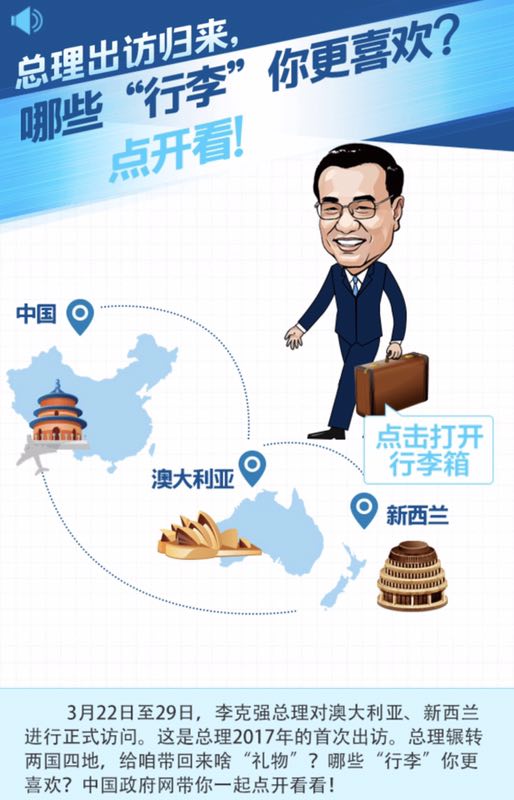 3月22日至29日,李克強(qiáng)總理對(duì)澳大利亞、新西蘭進(jìn)行正式訪問。這是總理2017年的首次出訪?偫磔氜D(zhuǎn)兩國四地,給咱帶來啥“禮物”?哪些“行李”你更喜歡?中國政府網(wǎng)帶你一起點(diǎn)開看看!