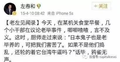 今年1月,左春和被免去石家莊文化廣電新聞出版局副局長的職務(wù),原因是在微博發(fā)表錯誤言論,嚴(yán)重違反政治紀(jì)律。
