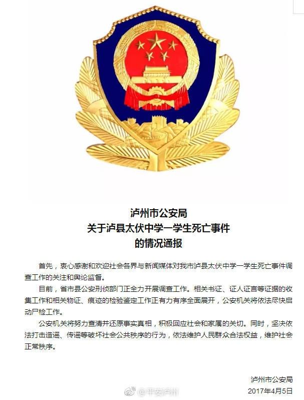 首先,衷心感謝和歡迎社會(huì)各界與新聞媒體對我市瀘縣太伏中學(xué)一學(xué)生死亡事件調(diào)查工作的關(guān)注和輿論監(jiān)督。