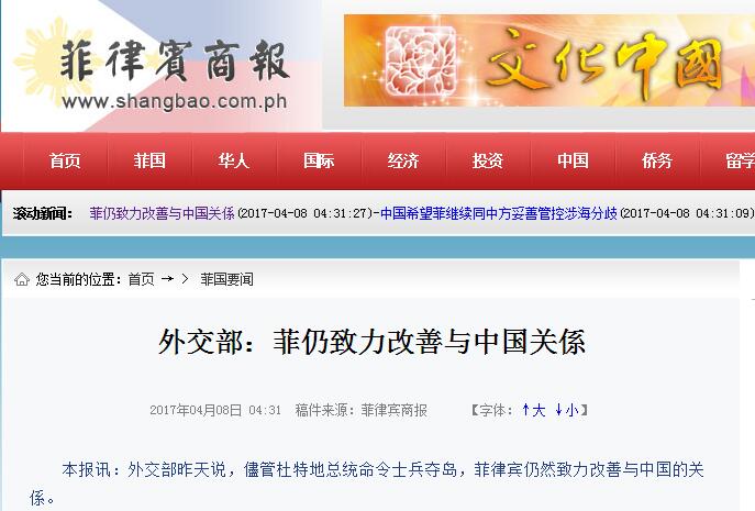 [環(huán)球網(wǎng)報道 記者 張驁]《菲律賓商報》4月8日報道稱,菲外交部7日表示,盡管總統(tǒng)杜特爾特“命令士兵奪島”,菲律賓仍然致力改善與中國的關(guān)系。