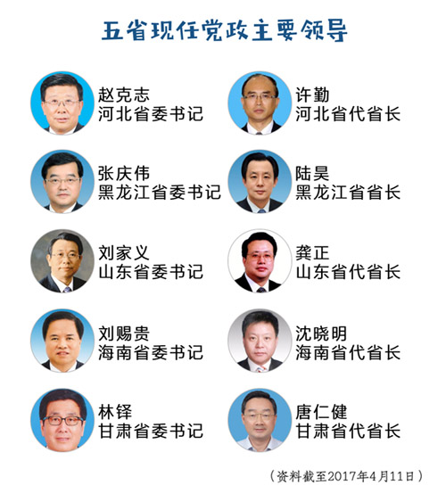 4月1日,黑龍江、山東、海南、甘肅四省省委主要負責同志職務調(diào)整。4位履新省委書記中,黑龍江省委書記張慶偉由河北省省長轉(zhuǎn)任,甘肅省委書記林鐸、海南省委書記劉賜貴2人為本省省政府“一把手”轉(zhuǎn)任,山東省委書記劉家義系中央“空降”。
