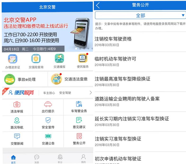 這是北京公安局推出的“北京交警”APP截圖,用戶可在首頁(yè)方便查詢業(yè)務(wù)辦理情況以及警務(wù)公開(kāi)信息。