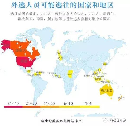 “海運(yùn)倉(cāng)內(nèi)參”(ID:hycplb)注意到,在貪官外逃的國(guó)家和地區(qū)里,西方發(fā)達(dá)國(guó)家是首選,在中紀(jì)委發(fā)布的這張地圖里也可清晰看出。美國(guó)、加拿大和澳大利亞,是外逃貪官的“首選”。