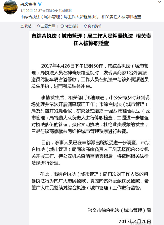 在此,興義市綜合執(zhí)法(城市管理)局對工作人員的粗暴執(zhí)法行為公開向廣大市民致歉,真誠向該外賣派送員致歉,表示希望廣大市民繼續(xù)對綜合執(zhí)法(城市管理)工作進行監(jiān)督。