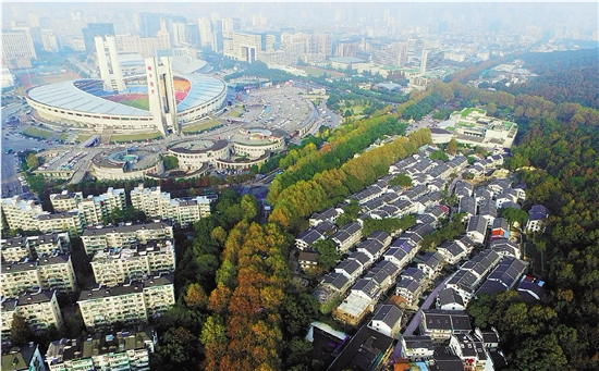 經(jīng)過(guò)一年半的整治改造,緊鄰黃龍商圈的白沙泉華麗轉(zhuǎn)身。圖為白沙泉航拍照。