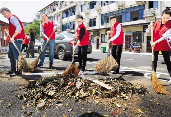 4月28日,杭州駱家莊社區(qū)的黨員干部和志愿者在清理改造后的建筑垃圾。