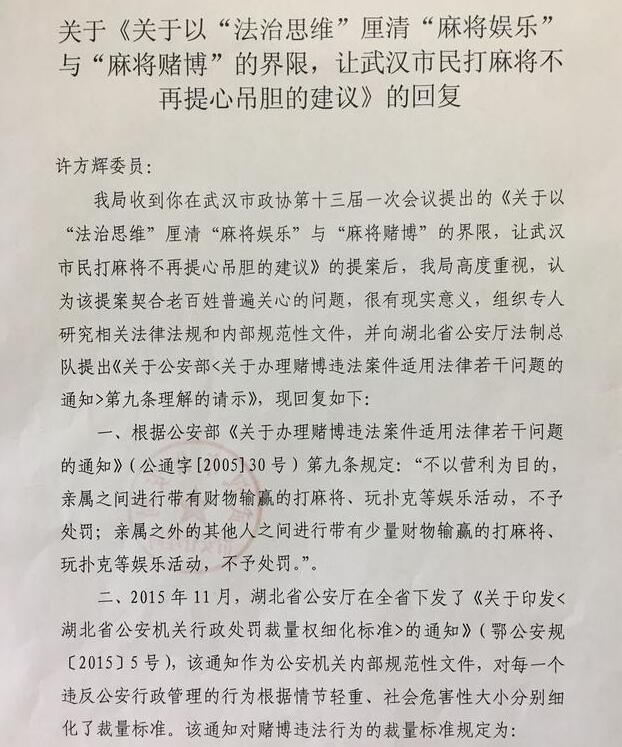 今年2月16日,市政協(xié)委員、湖北我們律師事務(wù)所主任許方輝律師向市政協(xié)第十三屆一次會議提出《關(guān)于以“法治思維”厘清“麻將娛樂”與“麻將賭博”的界限,讓武漢市民打麻將不再提心吊膽的建議》,經(jīng)審查立案。提案案件號為:武漢市政協(xié)第20170508號。