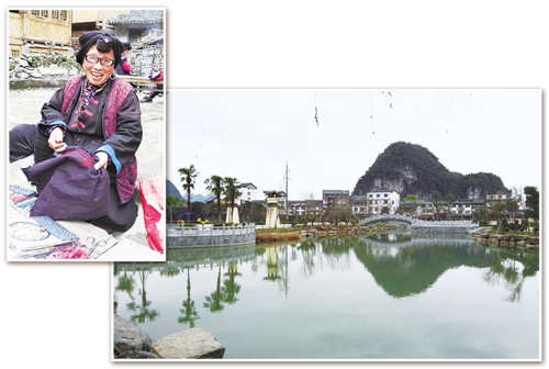 左上圖:廣西龍勝黃洛村瑤族阿媽潘鳳連在繡花,她的繡品受到游客喜愛(ài)。右下圖:湖南江永勾藍(lán)瑤村村景。(經(jīng)濟(jì)日?qǐng)?bào)記者 隋明梅攝)