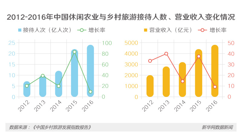 據(jù)統(tǒng)計,過去五年,中國鄉(xiāng)村旅游游客接待人次和營業(yè)收入年均增速分別達32.0%和26.2%。2016年,鄉(xiāng)村旅游游客接待已達24億人次,占國內(nèi)游客接待人次的54.4%;營業(yè)總收入達4800億元,占國內(nèi)旅游總收入的12.2%。預(yù)計到2020年,全國鄉(xiāng)村旅游年接待游客將超40億人次,實現(xiàn)總收入2.3萬億元。