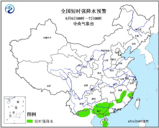 預(yù)計(jì)6月6日08時(shí)至7日08時(shí),廣西中部和江西南部等地的局部地區(qū)有雷暴大風(fēng)或冰雹天氣;江西東南部、福建東北部、廣西大部、廣東北部和西部、云南東部和海南南部等地的部分地區(qū)有短時(shí)強(qiáng)降水天氣,小時(shí)雨量20-40毫米,局地可達(dá)70毫米。