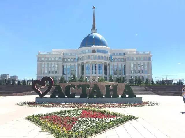總統(tǒng)府,外形參照哈薩克族傳統(tǒng)居所——氈房,圓頂?shù)乃{底金線為哈薩克斯坦的國旗色