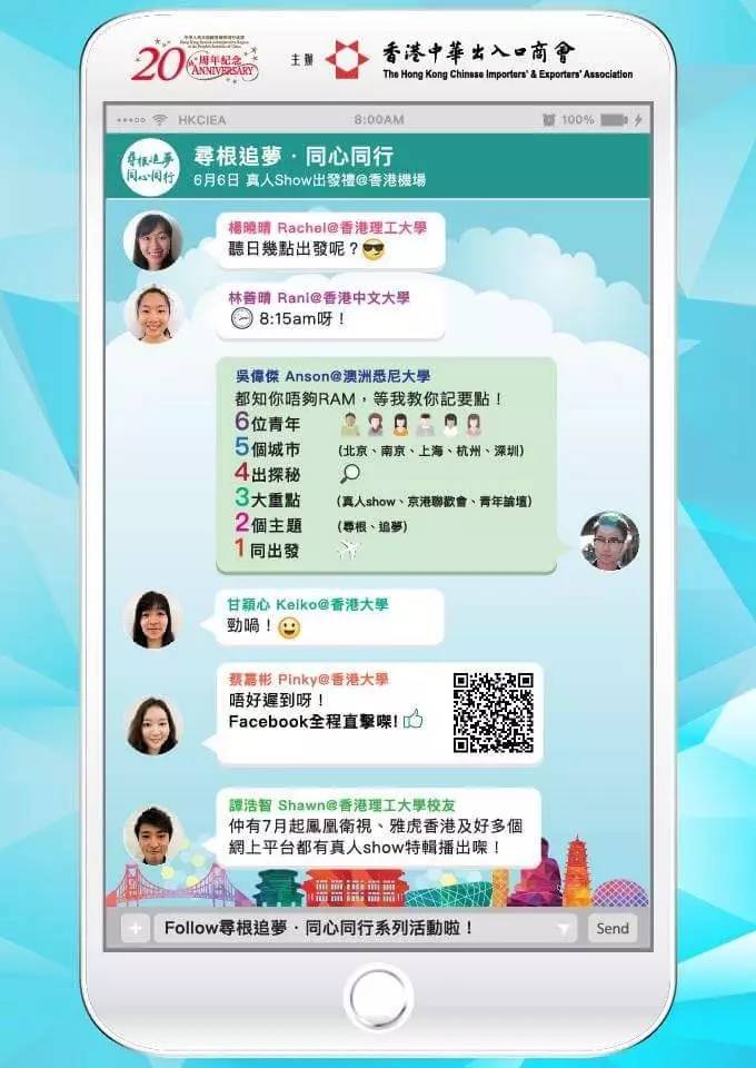 “尋根追夢 同心同行”活動挑選了6位來自各大院校及界別的年輕人一同到內(nèi)地進(jìn)行交流。參與活動的6位青年分別是來自香港大學(xué)的甘穎心(Keiko)、蔡嘉彬(Pinky),香港理工大學(xué)的楊曉晴(Rachel)及校友譚浩智(Shawn),香港中文大學(xué)的林善晴 (Rani),以及澳洲悉尼大學(xué)的吳偉杰 (Anson)。