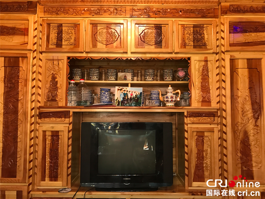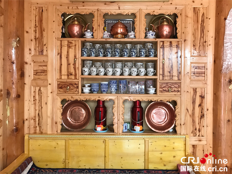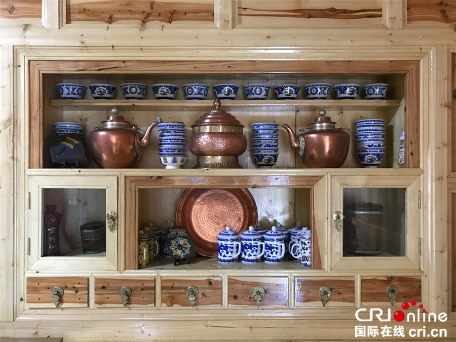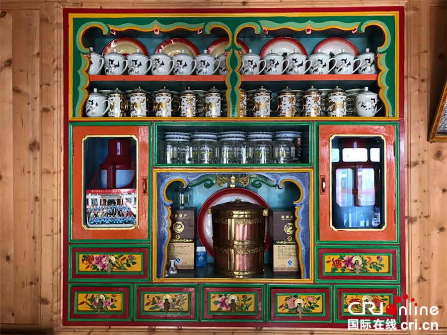 國際在線消息(記者 劉華楨 朱梅):在甘南藏區(qū),幾乎每戶藏民家的客廳里都會有這樣一個開放式的壁櫥,上面整整齊齊地擺放著瓷制的碗碟、茶壺、蓋碗,銅制的水壺、暖鍋、面盆,也許有點零食,也許還有幾瓶珍藏的好酒,有的人家讓它兼了電視柜的功能,有的人家還會放上一張全家福,溫馨滿滿。