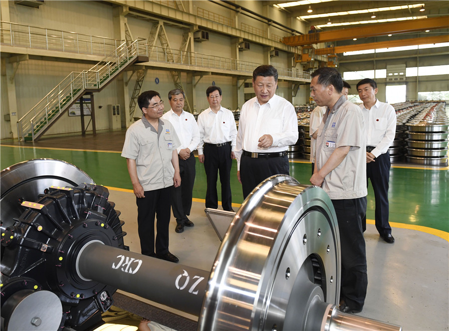 6月22日,習(xí)近平總書記在太原考察了兩家企業(yè)。太原重工軌道交通設(shè)備有限公司車輪車間機聲隆隆,熱軋生產(chǎn)線上鋼坯燒得通紅。總書記沿著高空走廊察看高鐵車輪生產(chǎn)流程,了解企業(yè)提升軌道交通裝備研發(fā)、設(shè)計、制造能力的情況。習(xí)近平還考察了盾構(gòu)機生產(chǎn)裝備情況,觀看了山西省自主創(chuàng)新成果展示。在山西鋼科碳材料有限公司,總書記同職工親切交流,勉勵他們發(fā)揚工匠精神,為“中國制造”作出更大貢獻。
