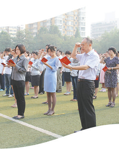 北京方莊教育集群師生大會(huì),黨員干部教師重溫入黨誓詞。